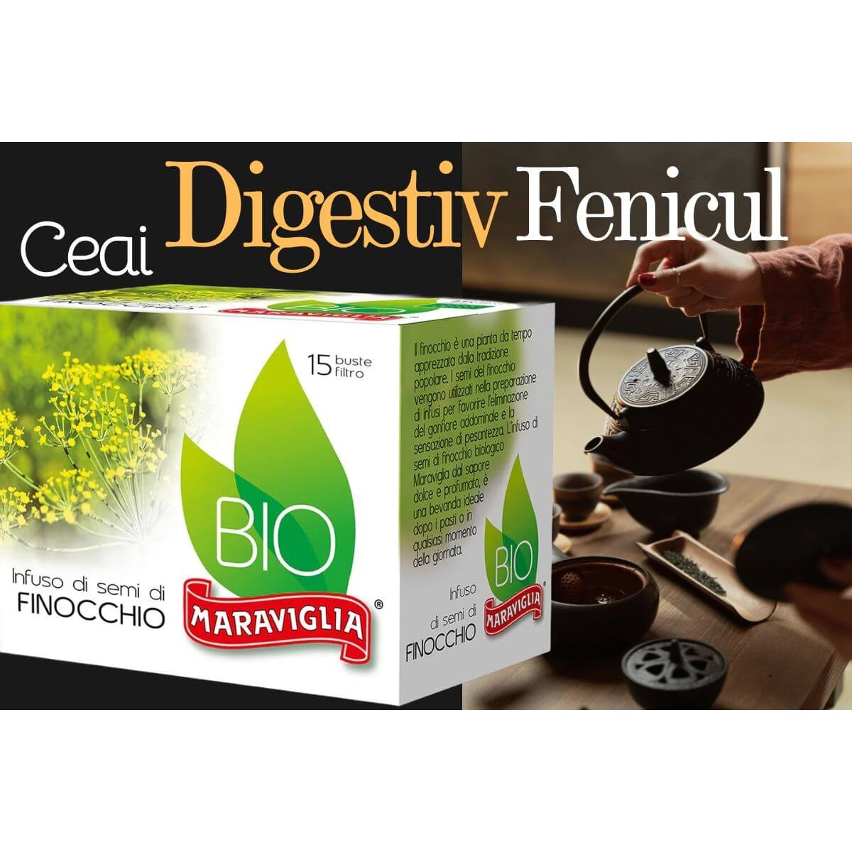 Infuzia de semințe de fenicul ajută la reducerea senzației de balonare, a gazelor și a disconfortului abdominal, susținând funcționarea normală a sistemului digestiv. Este cunoscut efectul său carminativ, favorizând eliminarea gazelor și stimulând în mod natural secreția sucurilor digestive, contribuind la o digestie mai ușoară.