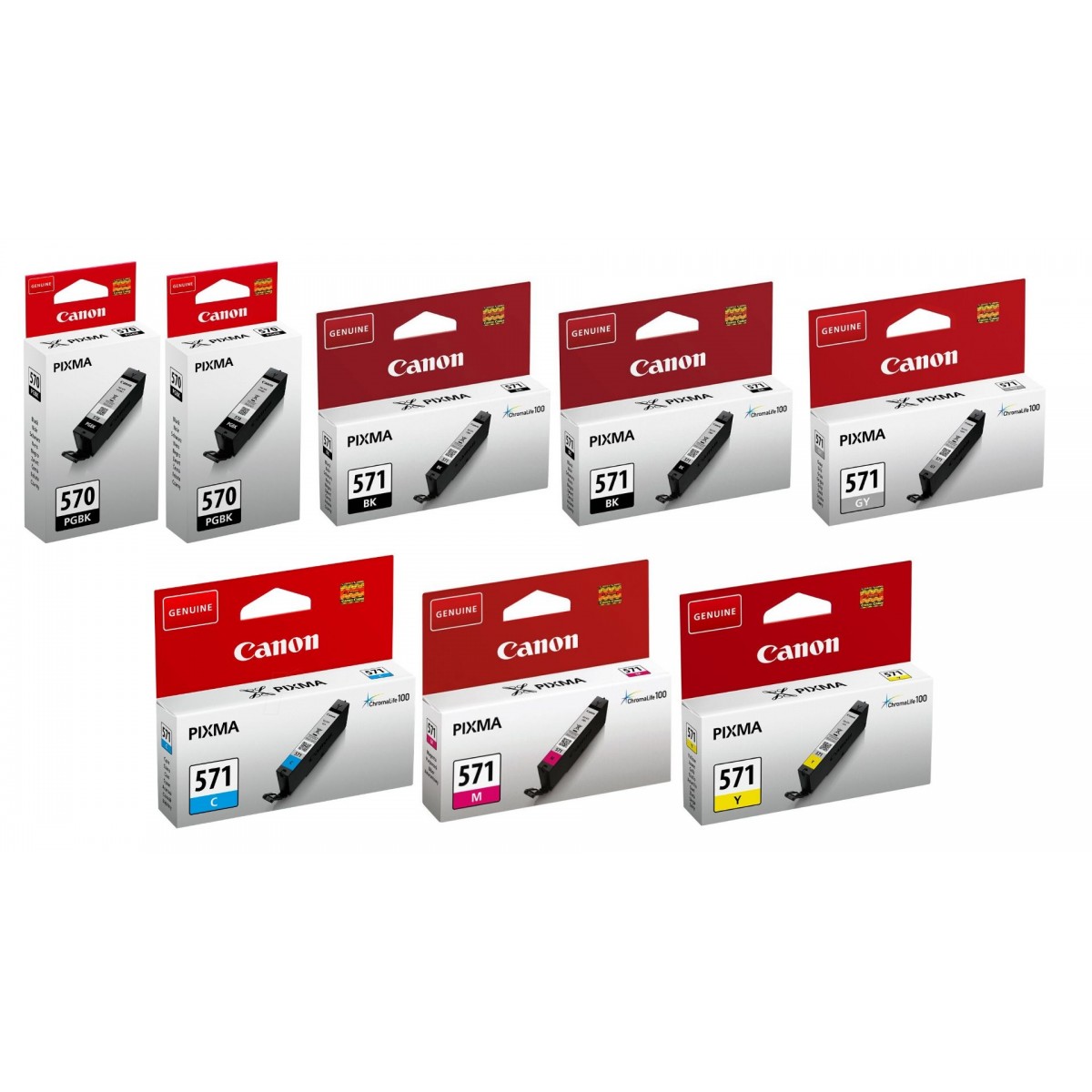 Descriere Pachet Cartuse Cerneala Original Canon 2x PGI-570B Negru, 2x PGI-570B Negru, 1x CLI-551C Cyan, 1x CLI-551M Magenta, 1x CLI-571Y Galben, 1x CLI-571GY Gri, 72 ml si pix Schneider