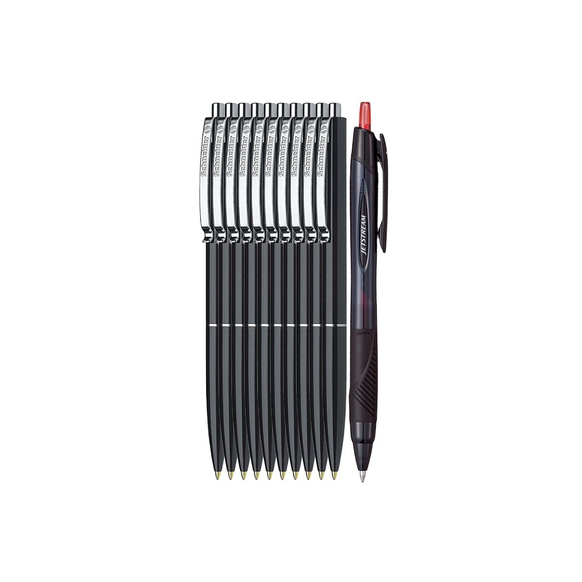 Setul Premium este alegerea ideală pentru profesioniști, elevi și pasionați de calitate germană în scris. Acesta conține 10 pixuri Schneider K15, culoare corp negru, cu scriere albastră, și un pix de top Uni-ball Jetstream – cunoscut pentru fluiditatea excepțională a scrisului și cerneala cu uscare rapidă.