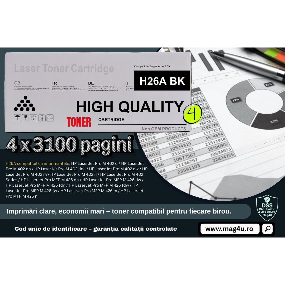 Alege acum Setul Cartuș Toner Compatibil HP26A, 4xCF226A, și bucură-te de mii de pagini imprimate la cost minim, cu cadouri utile pentru birou. Stoc limitat – comandă astăzi și economisește!