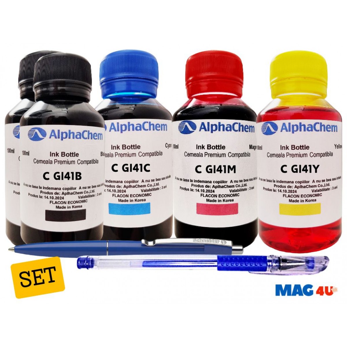 Obține performanțe de imprimare excepționale cu Setul de Flacoane Cerneală Compatibilă Canon GI41, conceput special pentru a oferi culori intense și detalii clare. Setul include 5 flacoane de cerneală (2x100ml Black, 1x100ml Cyan, 1x100ml Magenta, 1x100ml Yellow), perfecte pentru documente profesionale și imagini vibrante.