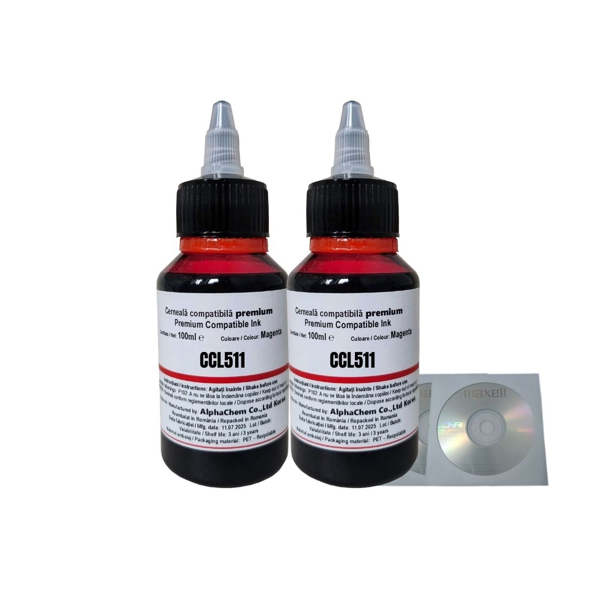 Descriere Set Flacon Cerneala AlphaChem Compatibil Canon 2x100ml CL-511M Magenta, 2buc Cdr Maxell cu plic