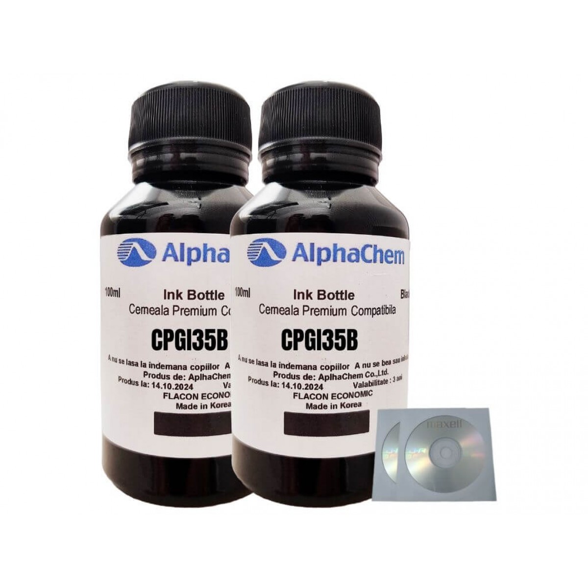 Set Flacon Cerneala AlphaChem Compatibil Canon 2x100ml PGI-35BK Negru, 2buc Cdr Maxell cu plic