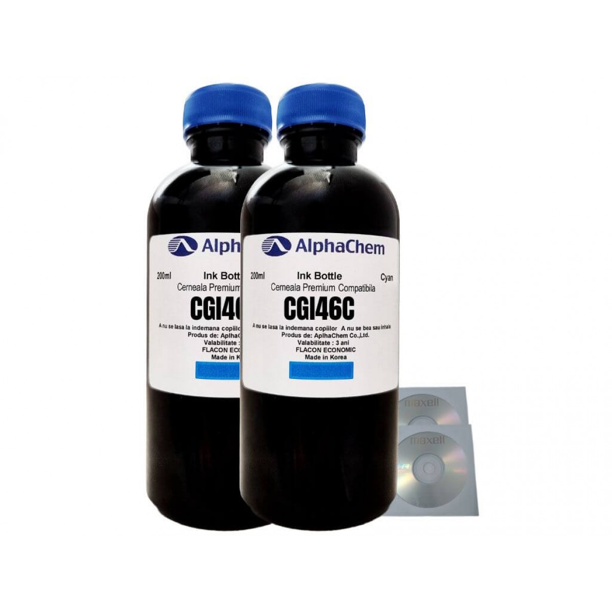 Set Cerneală Compatibilă Canon GI-46C Cyan – AlphaChem 2x200ml + 2 CD-R Maxell