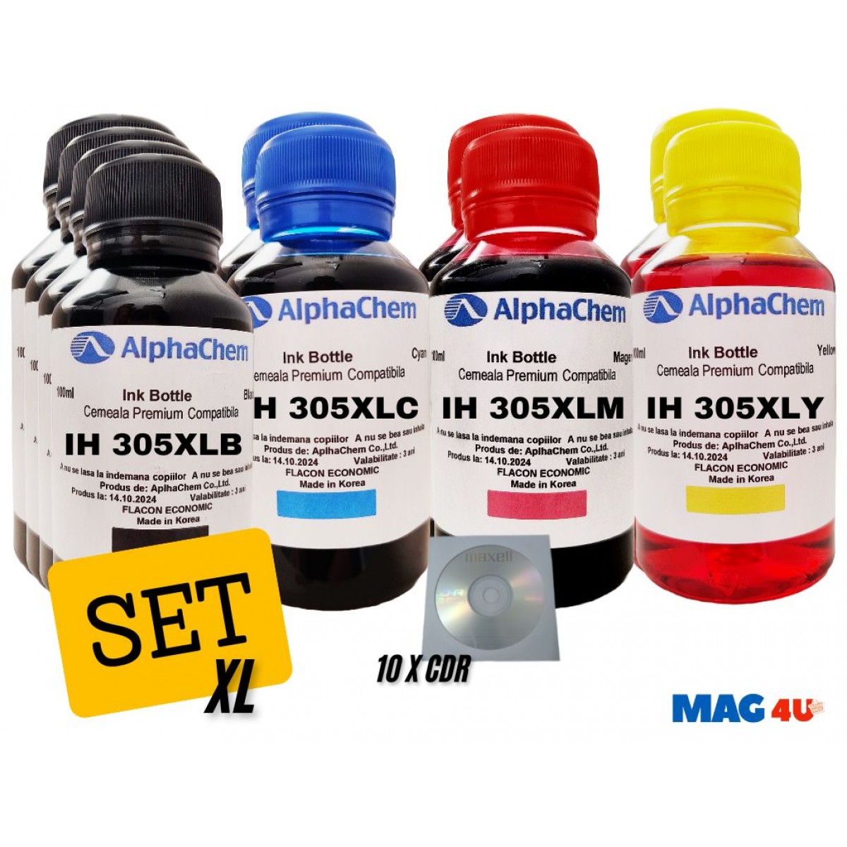 Descriere Set Flacon Cerneala AlphaChem Compatibil HP305XL 4x100ml 3YM62AE Negru + 2x100ml 3YM63AE Cyan + 2x100ml 3YM63AE Magenta + 2x100ml 3YM63AE Galben cu 10x CDR Maxell