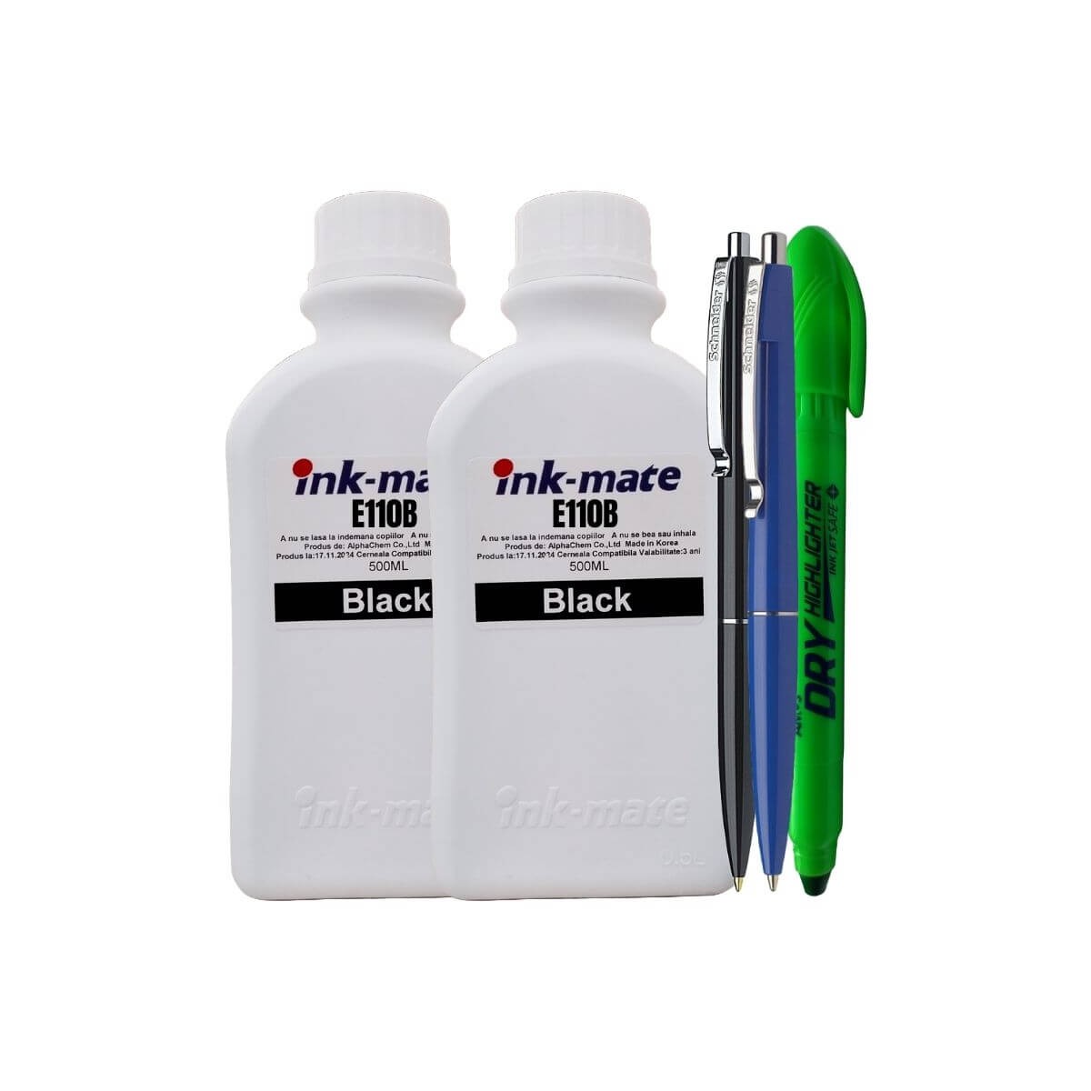 Set pentru imprimante Epson EcoTank, cu două flacoane InkMate 500 ml negru, 2 pixuri Schneider și textmarker non-toxic.