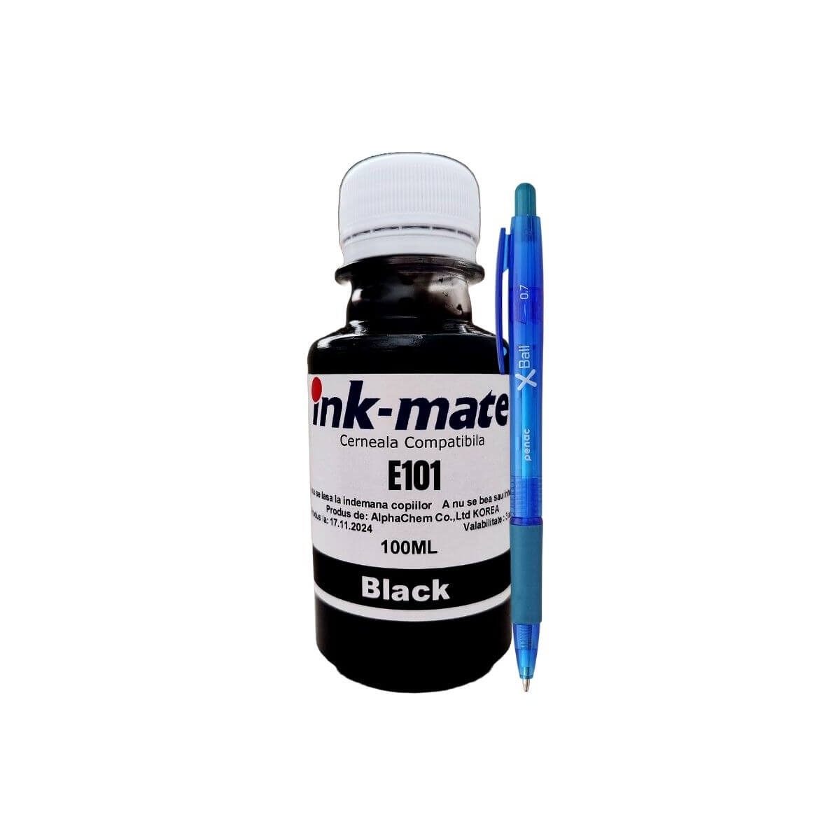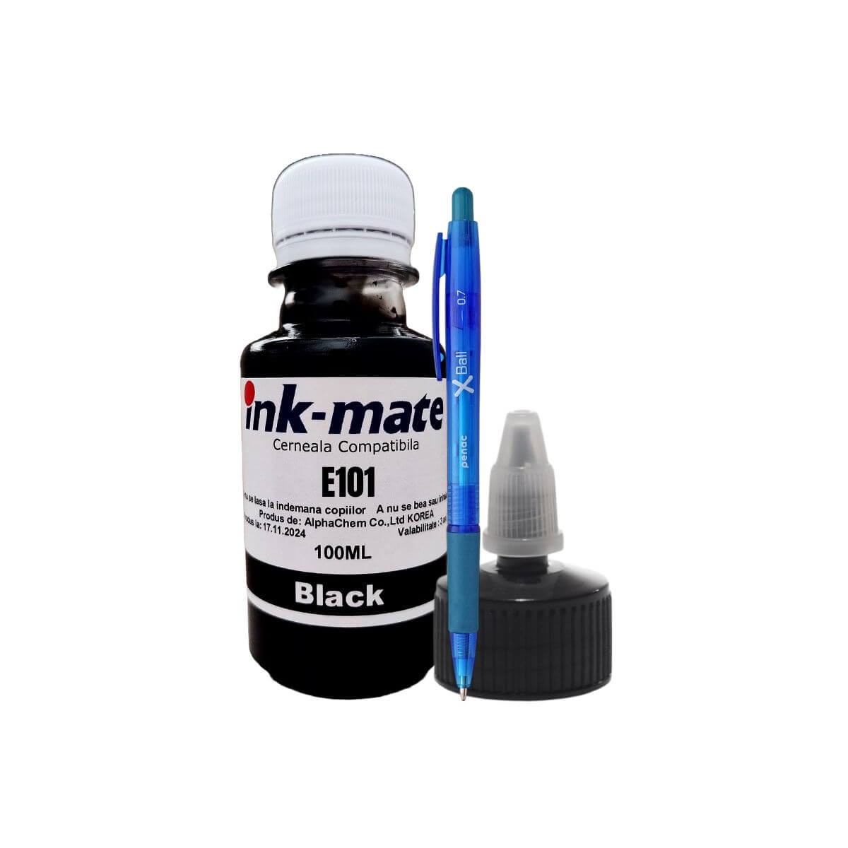 Setul Flacon Refill Cerneală Ink-Mate compatibil Epson (101) Negru, cu capacitate de 100 ml, cod C13T03V14A, este soluția ideală pentru imprimări clare și eficiente, fiind completat de un Pix Xball practic, perfect pentru birou sau uz zilnic.