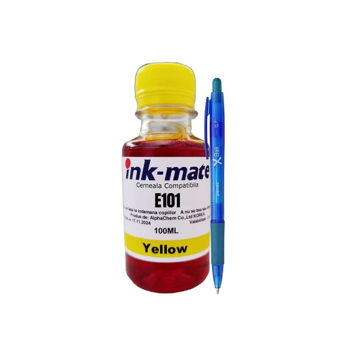 Setul Flacon Refill Cerneală Ink-Mate compatibil Epson (101) Yellow, cu o capacitate de 100 ml, cod C13T03V44A, este soluția ideală pentru imprimări color de înaltă calitate, oferind nuanțe galben intense, luminoase și uniforme. Setul este completat de un Pix Xball, practic pentru birou, școală sau utilizare zilnică.