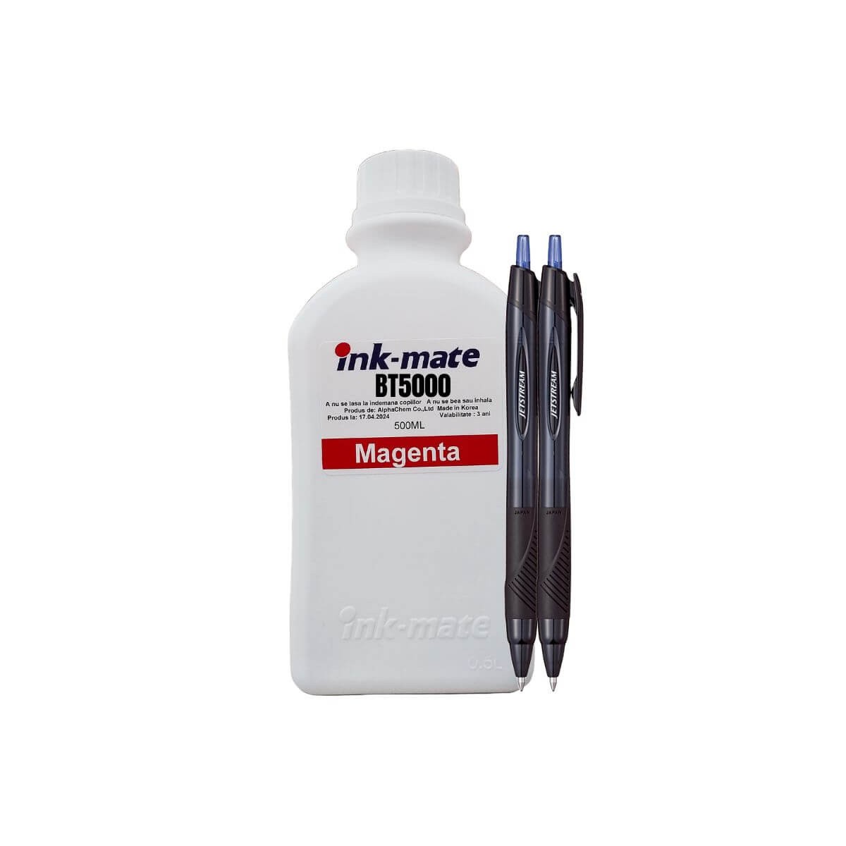 Cod produs FLP500BRO000157. Setul contine doua flacoane de cerneala compatibila Ink-Mate de culoare magenta, fiecare cu capacitatea de 500 ml, si doua pixuri Jetstream. Volumul total este de 1000 ml, oferind un randament total de aproximativ 20000 de pagini. Produsul este compatibil 100% cu imprimantele Brother T Series.